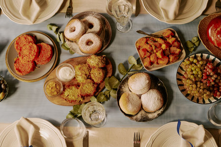 Top down shot of huge number of traditional treat on table top covered with tablecloth and green leaves