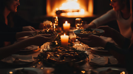 Capturing a joyful dinner gathering with friends and family around a beautifully set table during a festive evening