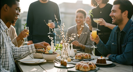 Golden Hour Feast Friends Gather for a Delicious Meal with Laughter and Shared Moments.