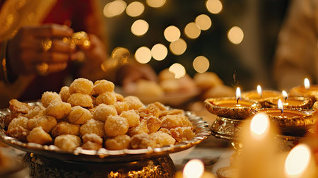 A beautifully arranged platter of Indian sweets shines with soft candlelight, creating a warm atmosphere perfect for festive celebrations and gatherings.