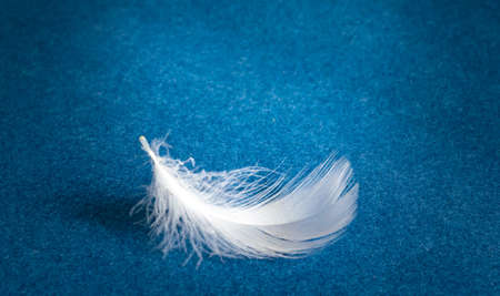 A soft feather gently floats in mid-air, its delicate strands illuminated by soft blue light, creating a calm and peaceful atmosphere.