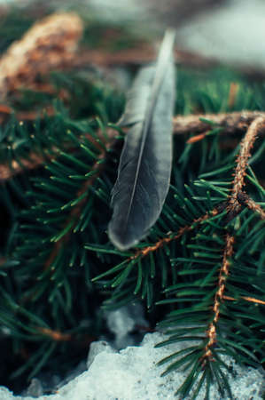 creative layout of branches of blue spruce. On the branches are a cone and feather of a bird. Template for design for Christmas holidays.