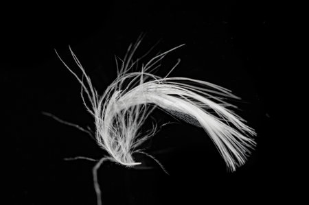 Contrast between light and dark colors. Soft texture of white feather on black background. Captures moments of natural beauty.