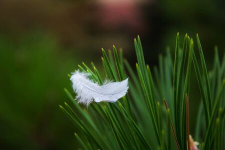 Amazing little white bird feather lies on the moss in the forest lit by the setting sun