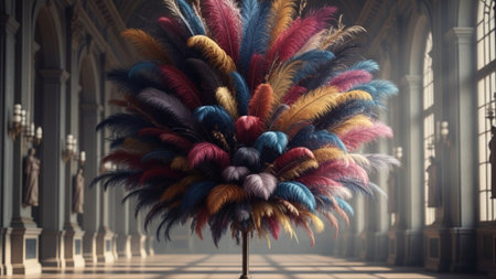 A vibrant and colorful feather duster resting on a marble surface, ideal for creative photography and home decor concepts, showcasing bright, feathery textures.