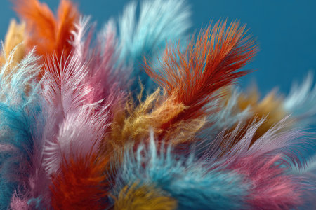 This close-up image showcases a collection of soft, colorful feathers. The feathers display a spectrum of hues, including orange, pink, yellow, and blue, creating a visually appealing texture. The composition utilizes a shallow depth of field, with a blue backdrop. These images are suitable for various creative projects and potential commercial applications.