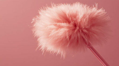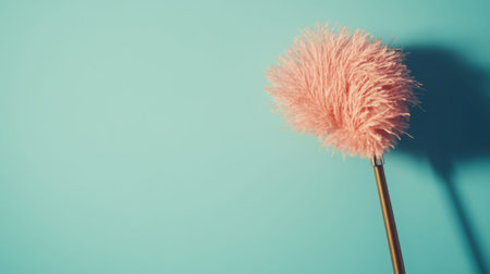 A bright and fluffy pink duster sits against a soft blue background, symbolizing modern cleaning tools perfect for stylish homes. Ideal for decoration and functionality.