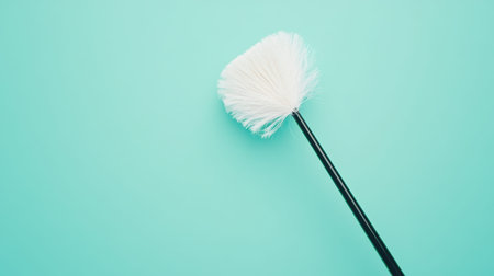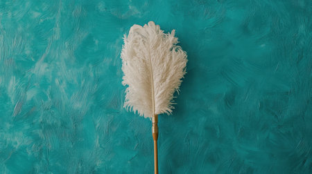 A soft white feather duster rests on a vibrant turquoise background, symbolizing cleanliness and home decor. This image captures simplicity and modernity.