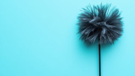 This image showcases a fluffy black pom-pom perched on a sleek black stick, set against a bright turquoise background, creating a striking visual contrast.