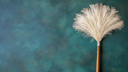 A stunning feather duster rests against a textured blue-green background, perfect for adding a touch of style to cleaning or home decor ideas.