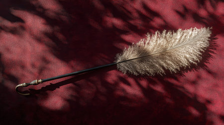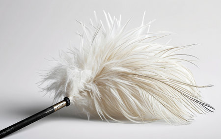 A beautiful and soft feather duster resting on a glossy surface, showcasing its delicate design. Ideal for enhancing home aesthetics while ensuring effective cleaning and dusting.