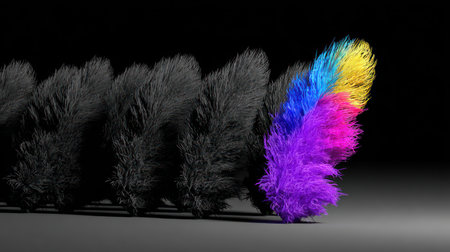 This abstract image features a row of dark furry forms with one transitioning into vibrant colors. The composition utilizes dramatic lighting and a shallow depth of field, highlighting the texture and color contrast. Suitable for creative projects, this image may be used for a variety of editorial or commercial purposes.