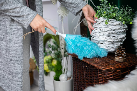 Woman's hand with a fluffy dust brush. A woman shakes off dust and crumbs from a table on which there are vases with tulip flowers.