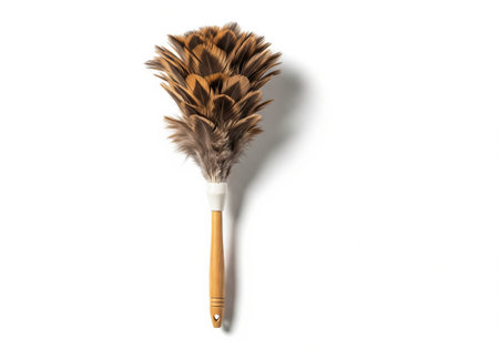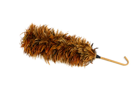Feather broom, Soft duster with plastic handle, white cabinet backdrop.