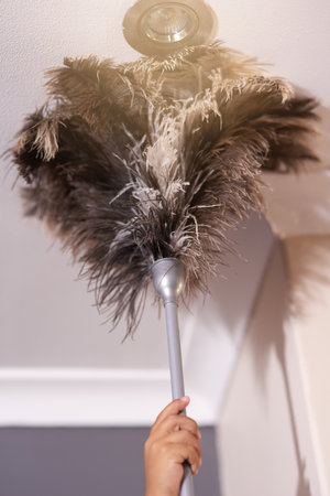 The dust didnt stand a chance. a person dusting the ceiling with a feather duster at home.