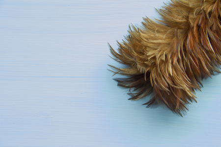 Striped fluffy duster on wooden background. Soft broom for cleaning on wooden background, copy space. Easy cleaning with colorful duster.