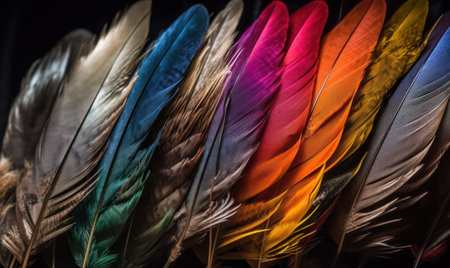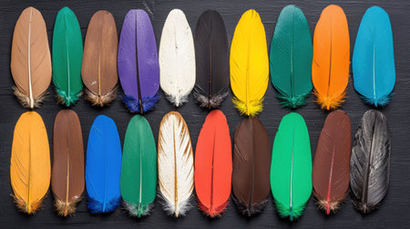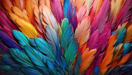 A stunning arrangement of colorful feathers displayed against a vibrant background, perfect for creative projects, design inspiration, and artistic themes.