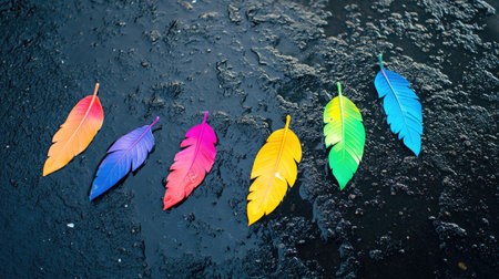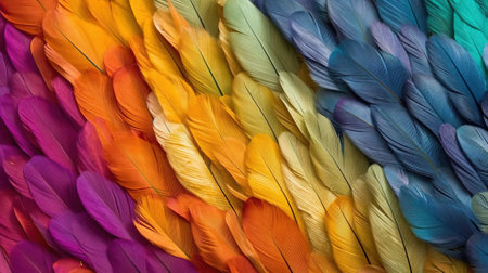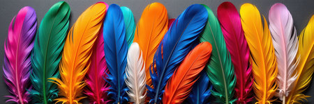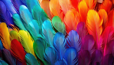 A Rainbow colored feathers arranged artfully create joyful atmosphere. Perfect for Pride celebrations and creative projects