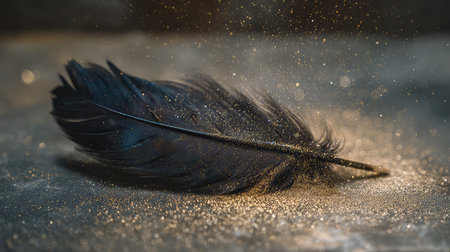 A stunning black feather rests on a textured surface, surrounded by sparkling dust, creating a captivating visual. The soft details emphasize nature's elegance and artistic beauty.