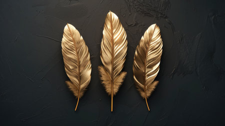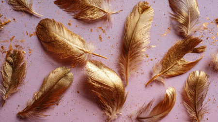 Delicate golden feathers scatter elegantly on a vibrant purple background, offering a luxurious touch perfect for creative projects, decor, or photography.