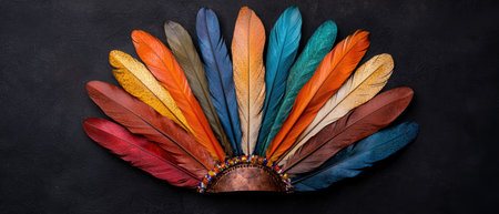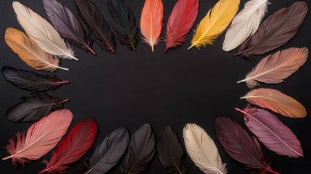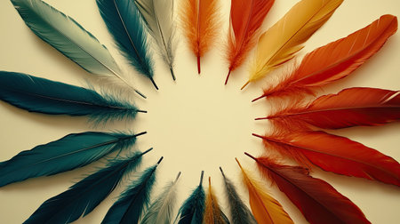 Colorful feathers are artistically arranged in a radial design, showing vibrant hues and intricate textures. The striking composition invites admiration and creativity.