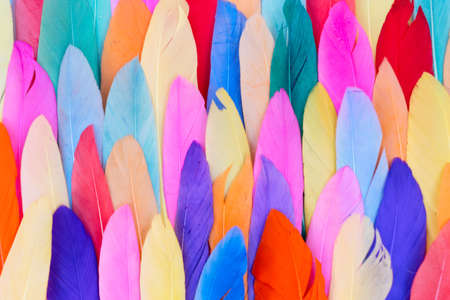 Close up to bright colorful feathers background. Colored feather background, top view.