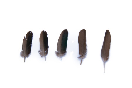 Colorful feathers on a wooden table. Selective focus. Toned.