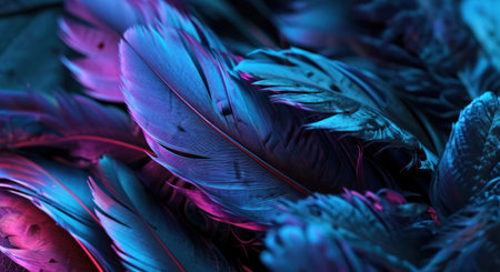 Close-up view of delicate dark blue feathers with intricate textures illuminated by soft light