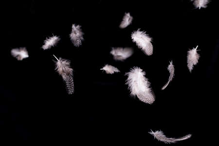 Beautiful flying delicate feathers on a black background, creative layout, soft white feathers floating in the air.