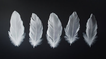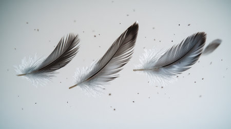 Abstract view of fluffy white feathers falling in slow motion against a dark background, creating a serene, weightless effect.