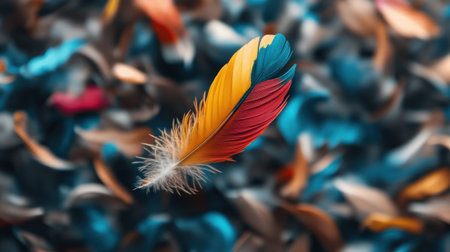 A brightly colored feather floating above a sea of ordinary feathers, symbolizing creativity