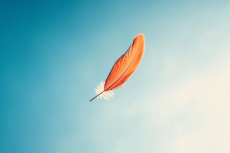 Orange feather floats gently against a serene blue sky, evoking feelings of peace, tranquility, and freedom