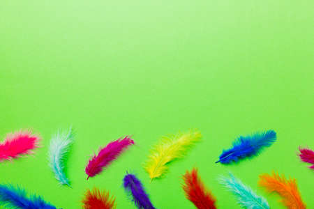background of brightly colored dyed bird feathers on Colored background, top view. copyspace.