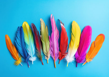 Colorful feathers arranged in a circular pattern on a bright blue background. Vibrant natural elements showcasing diversity and creativity in design.