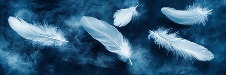 Ethereal White Feather Plumes Floating on a Deep Blue Abstract Artistic Background Composition
