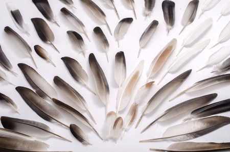 Colorful pattern made of feathers. MInimal boho style color concept, natural flat lay backgrund.