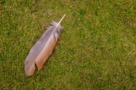 Beautiful blue fluffy feathers on a background of green grass and sunset