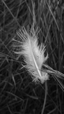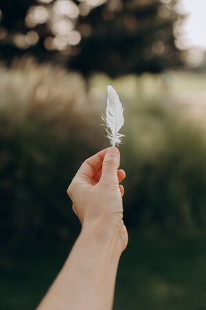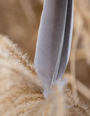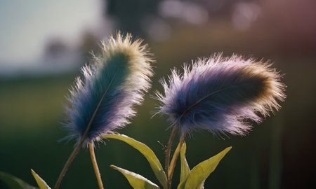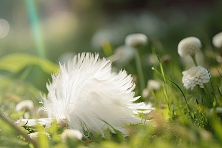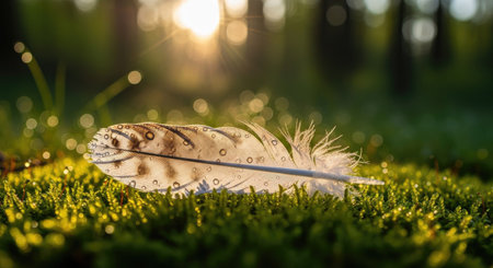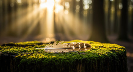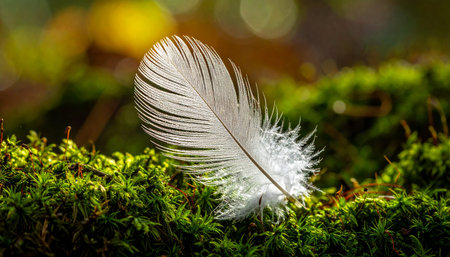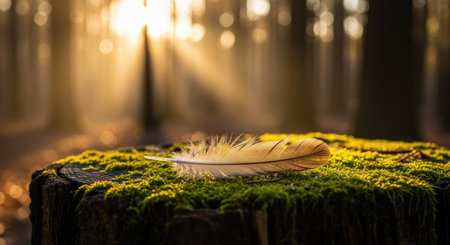Delicate feathers gently resting soft surface, illuminated by warm sunlight, create serene and tranquil atmosphere. intricate details of feathers are highlighted, showcasing their natural beauty
