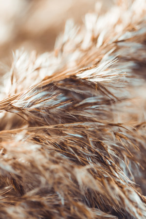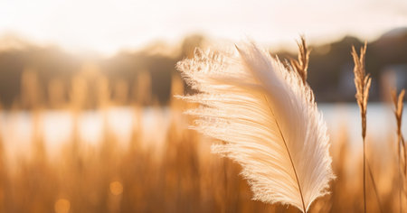 Pampas grass outdoor in golden morning sunlight. Dry reeds boho style.Trendy botanical background with fluffy pampas grass. Boho style plant decor bokeh nature landscape