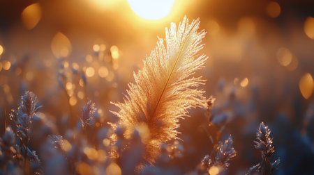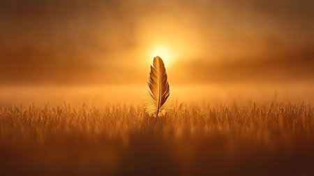 A solitary feather stands tall among the grass as the sun sets, casting a warm golden glow, evoking a sense of tranquility and natural beauty in the landscape.
