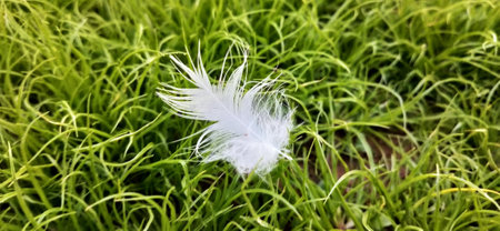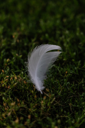 A single, pure white feather has gently fallen, coming to rest on a bed of vibrant green moss.