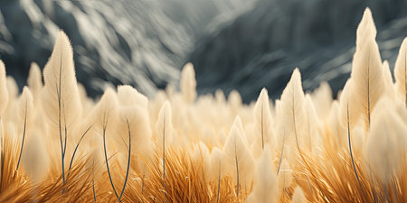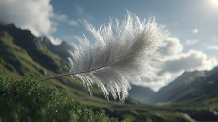 Close-up of a fluffy plume of grass, its delicate structure highlighted against the backdrop of a verdant mountain valley. The image showcases the natural beauty of the outdoors, with soft light and gentle textures. The mountain range in the background is visible.