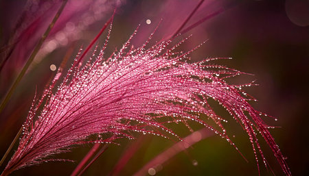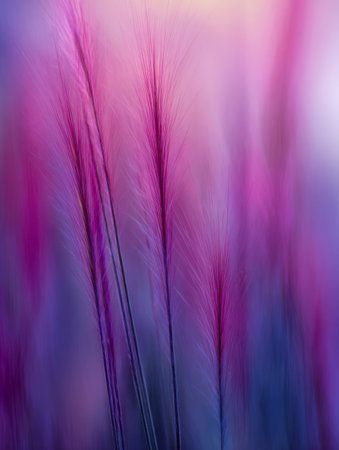 A close-up view of ethereal pink pampas grass showcases its feathery plumes, illuminated by a dreamy, diffused light. This serene composition evokes feelings of tranquility and natural beauty, inviting viewers to appreciate the elegance of natures artistry.