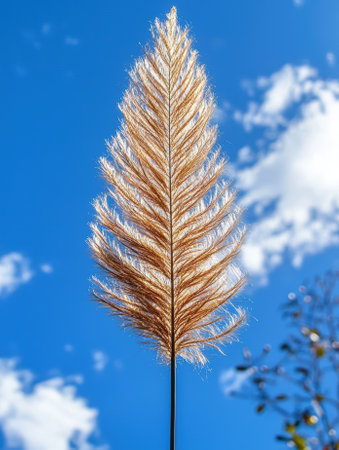 A detailed shot of a single dried plant stalk, showcasing its delicate, fluffy seed heads in warm, earthy tones.