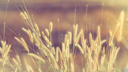 Macro image of wild grasses, small depth of field. Vintage effect. Beautiful rural nature Wild grasses at golden summer sunset vintage landscape background