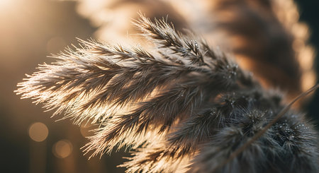 Closeup of the reed grass inflorescences in golden sunlight as a background