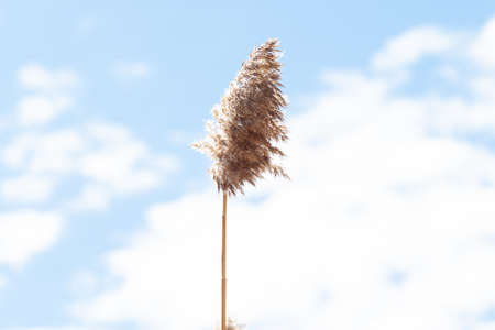 Dry reed flower on blue sky background with copy space.