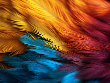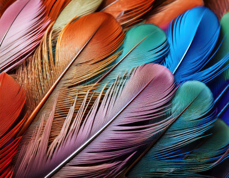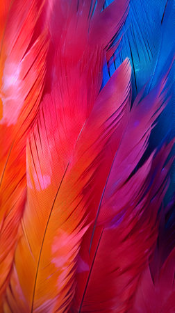 Capture the essence of nature's beauty with this vivid close-up of multicolor feather patterns showcasing intricate textures and bright hues.