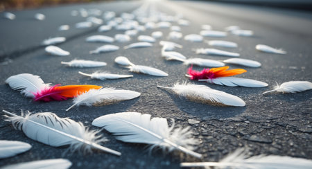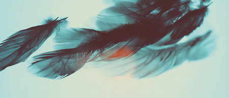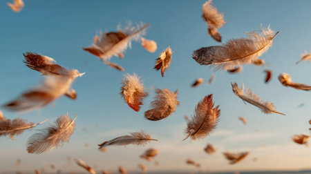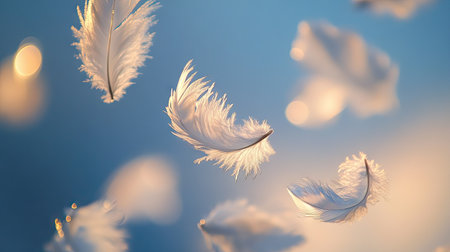 Floating feathers create serene and ethereal atmosphere against clear blue sky, evoking feelings of freedom and lightness. delicate textures and soft colors enhance tranquil scene