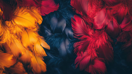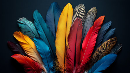 A stunning arrangement of colorful feathers in bold shades of yellow, red, and blue against a dark background, creating a visually striking and artistic display.